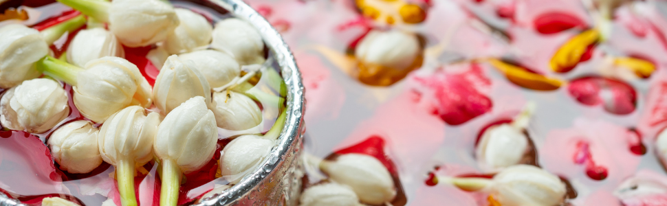 Water is the most iconic element of Songkran – and with good reason. In Thai culture, water symbolises purification and renewal. Traditionally, scented water infused with herbs or flower petals (often jasmine or marigold) was used to clean Buddha statues and sprinkle on the hands of elders to bring good fortune.