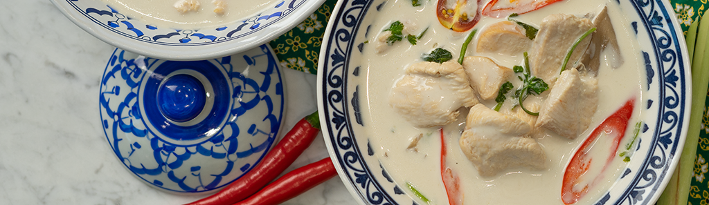 “Tom Kha” translates to “boiled galangal”, and this fragrant root is the soul of the dish. Originally from central Thailand, Chicken Tom Kha combines ingredients traditionally used for their medicinal properties—galangal for digestion, lemongrass for its calming aroma, and coconut milk to soothe and nourish.